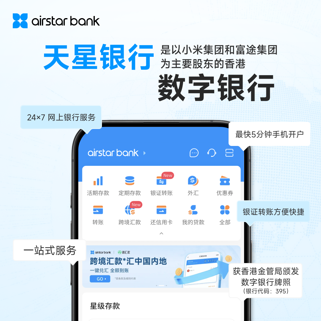 天星银行由小米集团与尚乘集团合资成立,是香港首批虚拟银行之一,于2020年正式开业。