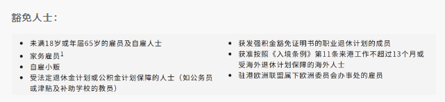 除豁免人群外,所有在港工作的员工(包含永居和非永居)、雇主,以及自雇人士均须按照一定比例缴纳薪资的一部分作为供款。
