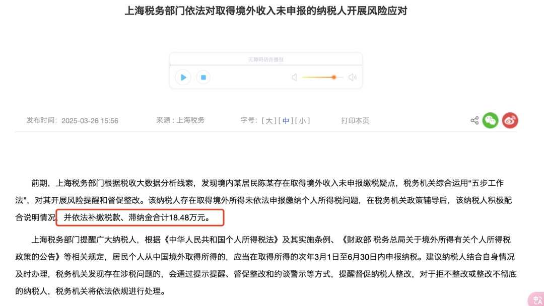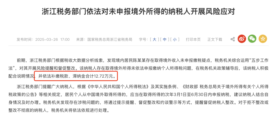 中国税务机关是怎么知道你境外资产的?您的境内外所得申报了吗? 2025年,中国税务机关显著加大了对居民境外收入申报的检查力度。 通过短信、个人所得税APP提示以及电话通知等多种途径,税务机关向大量高净值人群发送了关于海外收益个人所得税申报的提醒。 ![]() ![]() ![]() 前阵子国家税务机关全国多个地区的税务机关陆续发布了典型案例通报,披露了一批因未申报境外收入而被追缴大额税款的案件。这些被通报的纳税居民均存在未依法申报缴纳境外所得个人所得税的问题,最终分别补缴了141.3万元、126.38万元、18.48万元和12.72万元的税款及滞纳金,总计近300万元。 公告一出,搞得大家人心惶惶:“中国开始全球征税了吗??” 实际上,中国一直是全球征税国! 那中国税务机关是怎么知道你的境外金融信息的呢? 这就涉及到我们今天要聊的主角——CRS(共同申报准则)。 ➡ 记得关注「中界海外」并设为星标,每日为您分享境外小知识~ ![]() 注:本文素材来源于互联网公开渠道,如有侵权请联系删除。 ![]() ![]() 推荐阅读 ![]() ![]() ![]() ![]() ![]() 中界海外 · 企业网址 ![]() www.zjhw2020.com ![]() 中界海外,您远航世界的一站式海外服务平台。 专注为您提供海内外公司注册、离岸账户开设、审计、税务及财务咨询、国际金融牌照、国际知识产权、跨境电商、VIE架构、ODI境外投资备案、37号文等,为客户量身定做优选的企业发展方案~ 更多关于境外服务的专业解答,欢迎关注“中界海外”,给您最专业的建议、最用心的服务~ ![]() 微信公众号 | 视频号 | 抖音 | 微博 | 知乎 | 小红书ID 【中界海外】 ![]() ![]()