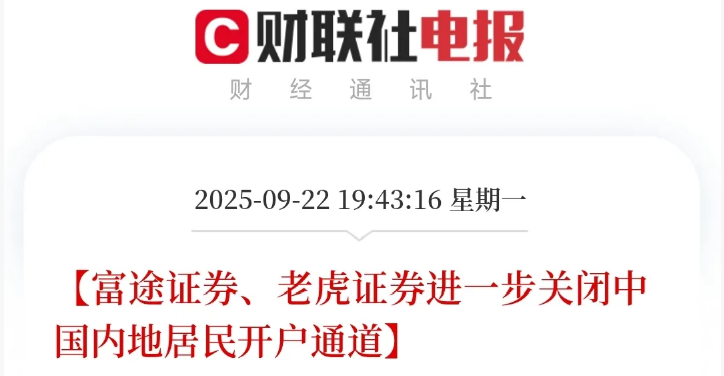 富途、老虎内地居民开户进一步收紧,盈透、长桥紧随其后……富途、老虎再收紧 近期,跨境互联网券商对中国内地居民的开户政策出现进一步收紧。 富途证券、老虎证券等机构已将开户要求从“海外生活工作证明”调整为“海外身份证明文件”,意味着内地普通投资者通过这类渠道进行境外证券投资的路径正在收窄! 从表面看,这是两家机构的业务调整,实则是境内金融监管体系对跨境证券业务规范力度持续加强的必然结果,背后折射出监管层维护金融安全、保护投资者权益的核心考量,也将深刻影响跨境证券服务行业的未来格局。 ➡ 记得关注「中界海外」并设为星标,将为您持续更新优质文章~ ![]() 注:文章内容来源**财经等互联网公开平台,如有侵权,请联系删除。 ![]() ![]() 推荐阅读 ![]() ![]() ![]() ![]() ![]() 中界海外 · 企业网址 ![]() www.zjhw2020.com ![]() 中界海外,您远航世界的一站式海外服务平台。 专注为您提供海内外公司注册、离岸账户开设、审计、税务及财务咨询、国际金融牌照、国际知识产权、跨境电商、VIE架构、ODI境外投资备案、37号文等,为客户量身定做优选的企业发展方案~ 更多关于境外服务的专业解答,欢迎关注“中界海外”,给您最专业的建议、最用心的服务~ ![]() 微信公众号 | 视频号 | 抖音 | 微博 | 知乎 | 小红书ID 【中界海外】 ![]() ![]()