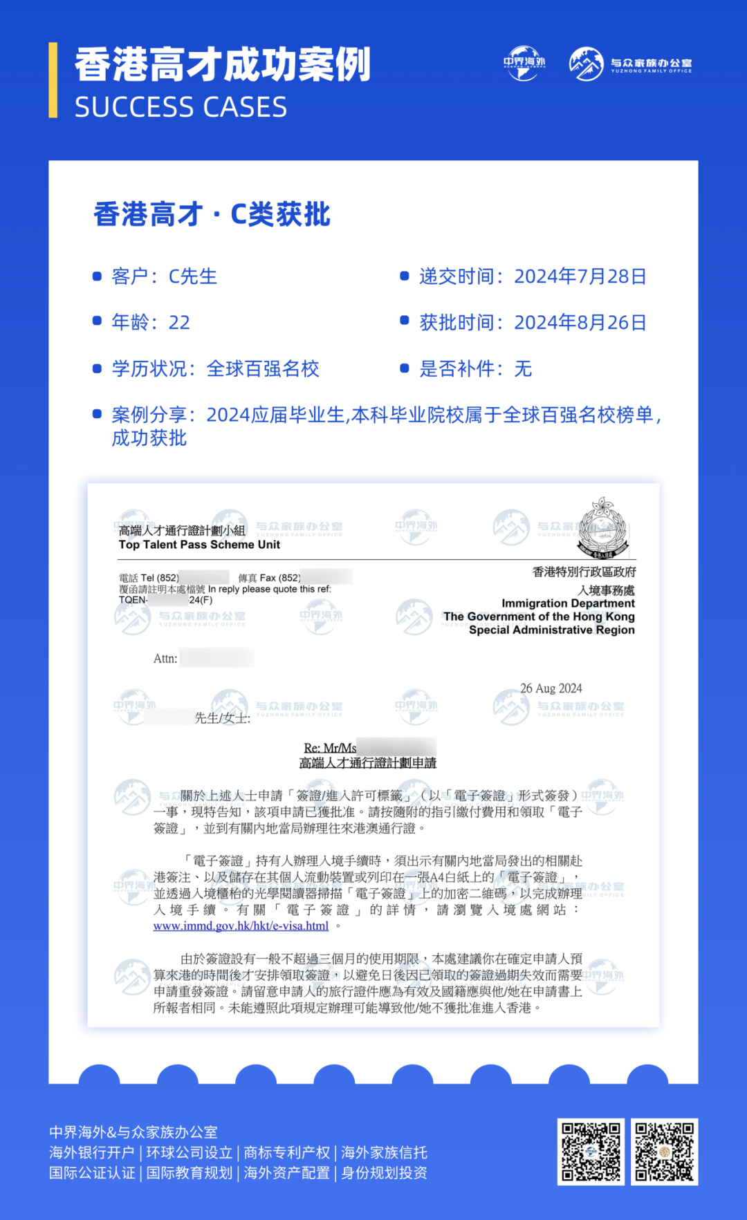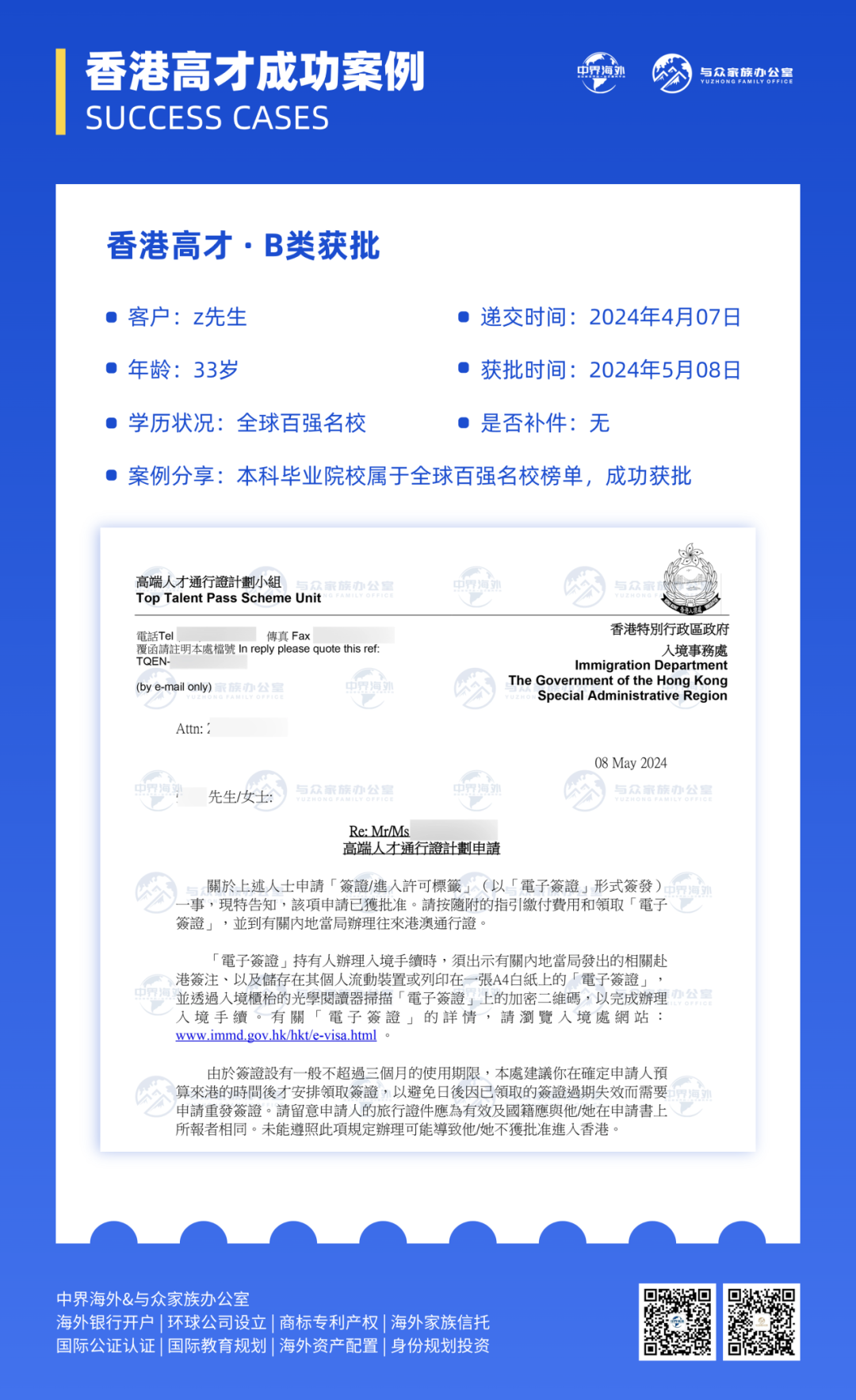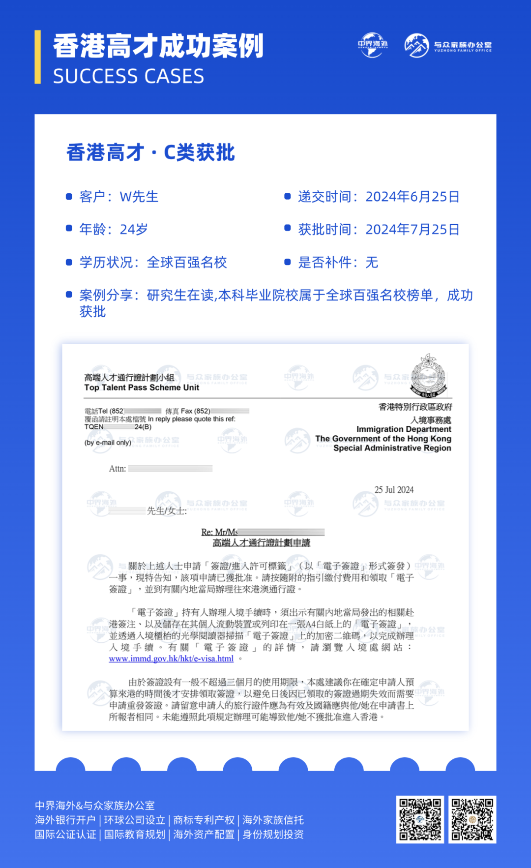 3月起,入境处严查!「香港高才」自雇类续签严审升级,空壳公司将被直接“拒批”!![]() 2025年3月起,香港入境事务处对自雇类别的续签申请展开“史上最严核查”,矛头直指空壳公司。 此举在相关群体中掀起了广泛关注。劳工及福利局局长孙玉菡明确表态:“无员工、无流水、无场地的‘三无’公司,续签一律拒批!” 这一政策变动让不少高才通计划申请人措手不及。 ![]() 香港高才通计划自推出以来,至今已批出逾9万宗申请。据孙玉菡3月12日透露,到今年第二季年中,将会有约1万张高才通签证到期,特区政府届时会公布更多数据。 现在的问题来了: 🔹 香港高才通怎么自雇续签? 🔹 哪些类型公司会认为是空壳公司呢? 🔹 高才创业自雇续签的关键是什么? ➡ 记得关注「与众家族办公室」并设为星标,将为您持续更新优质文章~ ![]() 此前,前香港特首、全国政协副主席梁振英在社交平台上“开炮”,他直言不讳的指出部分内地人借“人才”名义来港,只为孩子升学或在内地享受“港人港税”优惠,并对此行为提出了严厉批评,指出这违背了香港人才引进的初衷。 ![]() 他指出,近期他在内地多个城市的不同场合,遇到了不少以内地人才身份赴港报到后,迅速返回内地的情况。港府推出人才引进计划,目的是为了香港的繁荣发展,而不是为了让一些人来“薅羊毛”,更不是为了挤压本地学生的升学空间。 ![]() 此言论一出,立马一石激起千层浪,掀起热议。 所以,此次高才通政策调整背后是有深意的。随着香港人才引进计划的不断深入,不少申请人选择以自雇形式来申请续签。其中一些人却利用政策漏洞,注册空壳公司来骗取续签资格,这一行为既损害了政策的公正性,也对香港的营商环境造成了负面影响。 为了确保能够吸引并留住那些真正有才华、能为香港发展贡献力量的人才,而非让那些投机取巧者得逞,入境事务处决定加大对续签申请的审查力度。 确实,通过我司部分已经续签的案例来看,有些成功续签了两年,也有些只给了一年甚至是半年的续签时间。 通过我司续签过程中,我们也发现审核也是愈发严格!期间也要求补件几次,如下图(补件通知): ![]() 图 | 我司香港高才申请实例-要求补件通知 当然,最终也是成功续签!下图是我司【香港高才】续签成功的案例: ![]() 图 | 我司香港高才成功续签案例 根据港府的官方回答,以下两个问题答案,基本明朗: 01 空壳公司自雇续签,一定不可能成功! 香港劳工局局长孙玉菡强调:“尤其是高才通的朋友,不是一般常见的雇佣关系或者你的公司不是一个很明晰、雇佣了很多人、有很明显的业务运作的话,空壳公司就一定没有机会!如果你是譬如从事的职业是一直自雇的话,我们的审核会严格很多!” 02 自雇续签会被审查?为什么续签只会给半年或者一年? 香港劳工局局长孙玉菡表示:“在批准续签的时候,入境处如果觉得不是很肯定或者得给个机会你再证明,他未必会给满两年,可能给半年或一年的短的续签给你。目的是要更严格肯定清晰申请人是真真正正的来了香港且给香港带来了实质的贡献。” 01 缺乏实际经营场所 部分公司注册时仅使用虚拟地址作为门面,或其所登记的办公场所根本无法满足日常运营的基本要求。有的公司将注册地点设在普通居民楼内,入境处进行实地调查后,发现并无任何实际经营活动的迹象,这样的公司很大概率会被判定为空壳公司。 02 员工配置异常 正规运营的公司会根据其业务发展的需要,合理配置相应数量的员工队伍。但空壳公司往往没有实质性的业务活动,因此员工数量寥寥无几,甚至根本就没有员工。有一家申请自雇续签的公司,名下仅有一名职员,而且其具体工作职责含糊不清,经过深入调查后,该公司被确认为空壳公司。 03 缺乏实质性业务活动 若一家公司并未进行任何商业交易、未开展生产活动或未提供服务,仅仅作为一个注册的空架子存在,那么它很有可能会被认定为空壳公司。有些公司在注册后长时间内未签署任何业务合约、未开出过发票,且没有实际的产品或服务交付记录,这样的公司显然不符合正常运营企业的特征。 04 财务状况异常 这类公司往往账目管理混乱,资金流向模糊不清,资产负债表存在明显不合理之处。有些公司的财务报表上,收入与支出数额严重不匹配,或者资金流动异常频繁却缺乏合理的商业理由支撑,这些异常状况都将成为入境处重点调查的对象。 05 信息频繁变更 股东信息、法定代表人以及注册地址等核心要素频繁变动的公司,往往容易引起监管机构的疑虑。这种频繁变更可能暗示着公司经营状况的不稳定,或是试图隐瞒某些问题,这类公司自然而然地成为了入境处重点监控和关注的对象。 涉及以上雷点的朋友要注意了,这样续签大概率是不会通过的!!! ![]() 01 合法注册与实际办公场所 公司在香港必须依法完成注册,并且拥有实实在在的办公地点,这是其开展正常业务活动以及展现公司稳定性的根本前提。入境事务处会对公司的办公场所进行实地查验,以确认其是否满足正常运营的需求。 02 实质性业务与财务记录 公司应当具备清晰的业务发展方向,提供真实有效的业务合同、发票等相关文件,同时确保财务记录条理清晰、准确无误,包括但不限于银行月结单、详尽的财务报表以及专业的审计报告。 03 对香港经济的贡献 纳税历史、就业岗位的创造以及业务