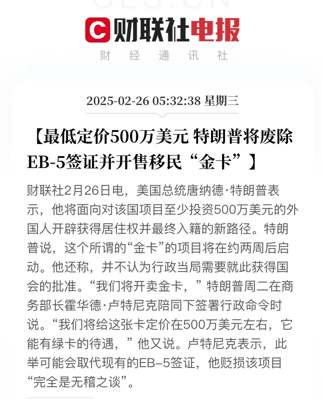特朗普开卖“美国户口”,计划500万美元换绿卡!EB-5要凉了?![]() 当地时间25日,美国总统特朗普宣布,他计划推出一项名为 “金卡” 的项目,该项目定价为500万美元,旨在为投资者开辟一条全新的入籍途径,而这一项目的目标,竟是取代已存续35年之久的EB-5签证。 ![]() 特朗普在相关声明中表示:“我们将出售金卡,定价大概为500万美元。一旦拥有这张卡,就能够享受绿卡权益,同时还提供了合法获取公民身份的途径。” 他还特别强调,这一 “金卡” 项目无需经过国会批准,并且乐观预计最终可能售出1000万张。特朗普描绘了潜在 “金卡” 申请人的大致轮廓,称他们是 “有钱人,且是能够创造工作岗位的人” 。 ![]() 具体内容让我们一起来看看。 ➡ 记得关注「与众家族办公室」并设为星标,将为您持续更新优质文章~ ![]() 根据特朗普的声明,“金卡”将允许外国投资者通过支付最低500万美元,直接获得美国绿卡待遇,并拥有未来入籍的通道。 从现有的公开信息来看,“金卡”有以下核心设定: 🔹定价门槛:500万美元起(约合人民币3600万),是原EB-5签证的5倍!资金直接汇入财政部指定账户,而非企业项目。 🔹 核心待遇:持卡人享受绿卡同等权利,包括在美自由工作、居住,并拥有未来入籍的途径。 🔹 启动时间:计划在宣布后两周内(约2025年3月中旬)开始实施。 🔹 附加条件:需通过背景审查,确保申请人为“***优秀公民”。 🔹 企业可参与:特朗普表示,像苹果这样的公司也可以选择支付500万美元,从而获得批准,让外国人才居住在美国。 ![]() 特朗普直言不讳:“富人将带着钱、税和工作机会来美国,这会非常成功!” 美国商务部长Howard Lutnick周二表示,特朗普金卡将在两周内取代EB-5签证。金卡实际上是绿卡的另一种形式,代表了持有人在美国的**合法居留权,其将提高投资者的准入门槛,且不会存在EB-5的欺诈风险。此外,金卡也为持有人提供入籍通道。 特朗普称,金卡有点像绿卡,但在绿卡的层次之上。其是人们获得美国公民身份的途径,特别是对富人和天才来说。富人和公司也可能通过资助,让高技能或高学历的人才进入美国并获得长期在美的身份。 特朗普还指出,金卡的颁发将不需要国会批准。他认为联邦政府可以出售1000万张金卡来减少财政赤字。 他随后给出了一个计算题:假如有100万人购买,那么美国政府可以获得5万亿美元。假如1000万人购买,那么美国政府可以获得50万亿美元,那么35万亿美元的债务将迎刃而解。 ![]() “金卡”新政的目标人群主要面向全球富豪、企业巨头(如苹果等公司可集体购卡),尤其是能创造就业、推动经济发展的高净值投资者。甚至包括部分受制裁的俄罗斯寡头——特朗普称“他们可能是好人”。 目前,特朗普表示“金卡”计划将在两周内启动,但具体细节尚未公布。 如果这一计划顺利实施,富人移民美国的成本将飙升5倍,而普通家庭通过EB-5移民的路径或被彻底堵死。 ![]() 01 对美国经济的影响 特朗普认为,金卡计划将为美国带来巨额财政收入,同时减少国家债务。如果成功卖出100万张金卡,美国政府将获得5万亿美元的收入,这对于当前35万亿美元的国家债务来说,无疑是一个巨大的补充。 02 对移民政策的影响 金卡计划的推出将彻底改变美国的移民格局。以往,EB-5项目主要吸引中等富裕阶层,而金卡计划则直接面向超级富豪。这可能会导致美国移民群体的结构发生变化,未来移民美国的门槛将大幅提高。 03 对全球移民市场的影响 金卡计划的推出可能会引发全球移民市场的震动。其他国家的投资移民项目,如马耳他、希腊、葡萄牙、西班牙等,可能会面临更大的竞争压力。同时,全球最富有的人群可能会将目光转向美国,寻求通过购买金卡进入美国的机会。 ![]() 金卡是否真的会彻底取代EB-5投资移民? 一旦金卡项目顺利落实,这恐怕会成为美国历史上首次向外国人直接出售绿卡的项目。 面对特朗普在移民与投资领域掀起的这场风暴,许多投资者心中充满了疑问:“EB-5签证项目真的会在两周后停止吗?”“那些之前已经提交申请或正在申请的人会受到影响吗? 实际上,美国国会于2022年通过的EB-5改革及诚信法案(RIA)的有效期至2027年9月30日。 此外,该法案包含一项“祖父条款”,确保所有在2026年9月30日之前提交的EB-5申请不受将来法律或政策变更的影响。 法案中关于祖父条款的描述: 1)在2026年9月30日之前递交的投资人均受法案保护; 2)任何机构不可以政策调整为理由拒签已递交申请; 3)任何机构不可以终止或暂停对符合条件申请人的签证发放。 也就是说,对于已经投资的客户,“祖父条款”将保证按照现行法律投资的申请人权益。 同时,EB-5项目是移民法案,不能简单通过行政令被取消。 如果您有意申请美国EB-5投资者签证,享受低成本投资获取美国绿卡的政策利好,那么现在是把握时机、迅速行动的时候了。 ![]() 01 双递交,小绿卡 在美国境内递交I-526E,可同时递交I-485转换身份,收到回执以后就可以在美国合法停留。同时递交I-765工作许可、I-131回美证,就可以获得Combo小绿卡,可以在美国合法工作、自由进出。双递交政策对留学生非常友好,2-3个月就能拿到工卡,解决在美国找工作难、H-1B抽签难的问题。 02 最低投资期为2年 “新法EB5的最低投资期为2年,且如果完成两年投资期时,I-526或I-526E还没有被审理,仍然可以还款,并且不影响I-526或I-526E的批