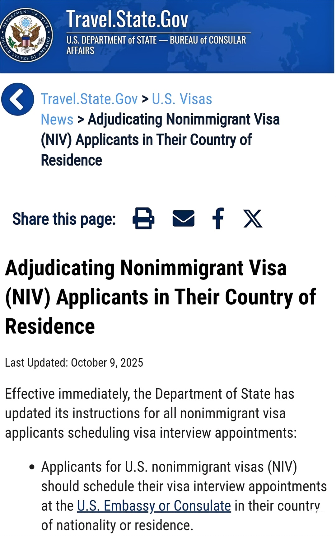 美国国务院宣布,自2025年11月1日起,移民签证面谈地点规则迎来重大调整: