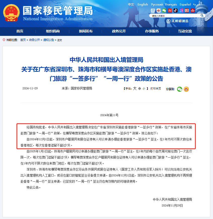 重磅利好!港澳正式施行“一签多行”!往返不限次数!附手把手续签指南→“一签多行”“一周一行” 正式登场 国家移民管理局于 11 月 29 日正式发布公告,经国务院批准,中华人民共和国出入境管理局决定在广东省深圳市重启赴香港旅游 “一签多行” 政策。 这一政策的出台,无疑为广东居民往来港澳提供了前所未有的便利。 文章第4部分小编为大家准备了非常详细【港澳通行证续签指南】,可以分享给身边的朋友哦~ ➡ 记得关注「中界海外」并设为星标,每日为您分享境外小知识~ ![]() ![]() ![]() 推荐阅读 ![]() ![]() ![]() ![]() ![]() 中界海外 · 企业网址 ![]() www.zjhw2020.com ![]() 中界海外,您远航世界的一站式海外服务平台。 专注为您提供海内外公司注册、离岸账户开设、审计、税务及财务咨询、国际金融牌照、国际知识产权、跨境电商、VIE架构、ODI境外投资备案、37号文等,为客户量身定做优选的企业发展方案~ 更多关于境外服务的专业解答,欢迎关注“中界海外”,给您最专业的建议、最用心的服务~ ![]() 微信公众号 | 视频号 | 抖音 | 微博 | 知乎 | 小红书ID 【中界海外】 ![]() ![]()