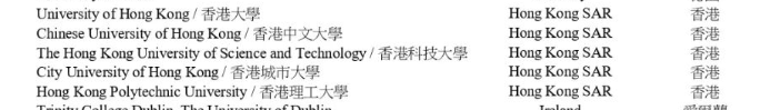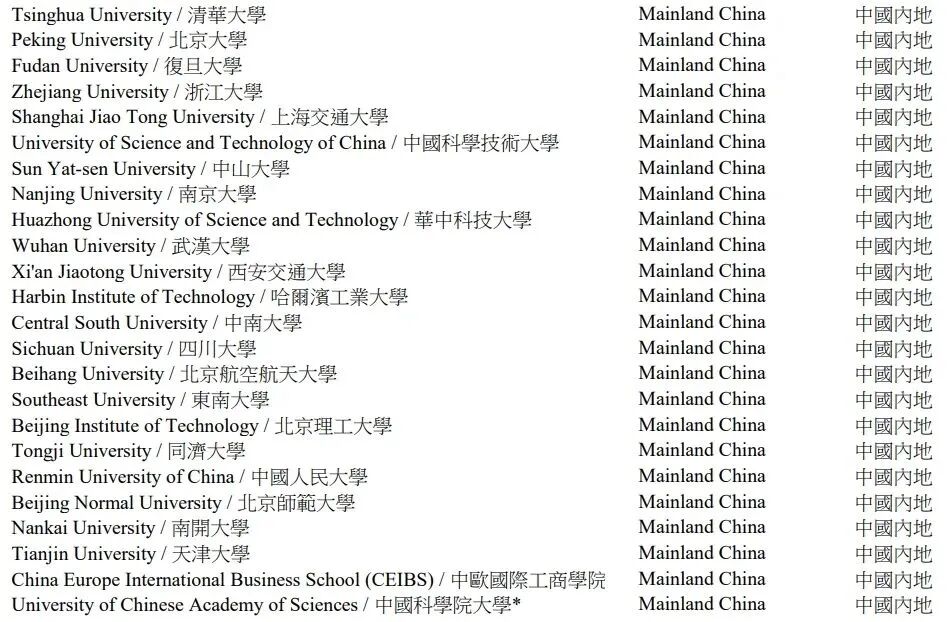 截至目前加上国科大,内地共24所大学在列,分别是: 清华大学、北京大学、复旦大学、浙江大学、上海交通大学、中国科学技术大学、中山大学、南京大学、华中科技大学、武汉大学、西安交通大学、哈尔滨工业大学、中南大学、四川大学、北京航空航天大学、东南大学、北京理工大学、同济大学、中国人民大学、北京师范大学、南开大学、天津大学、中欧国际商学院、中国科学院大学(新加入) ![]() 香港合资格大学名单(5所)分别是: