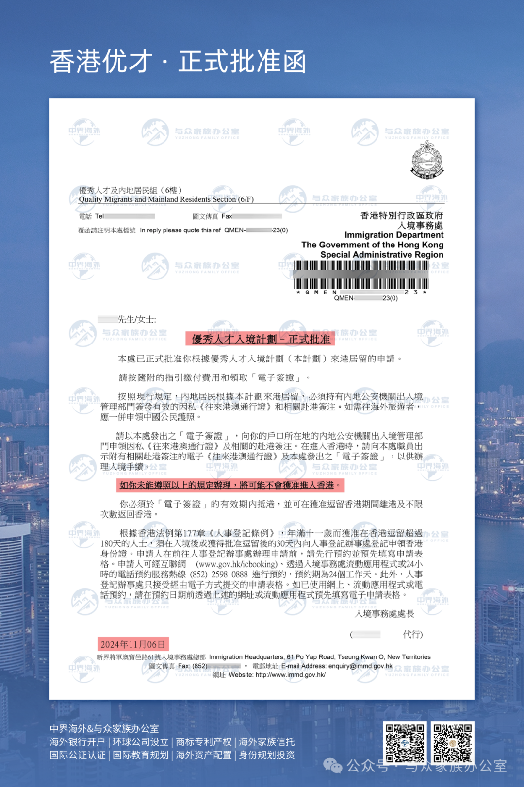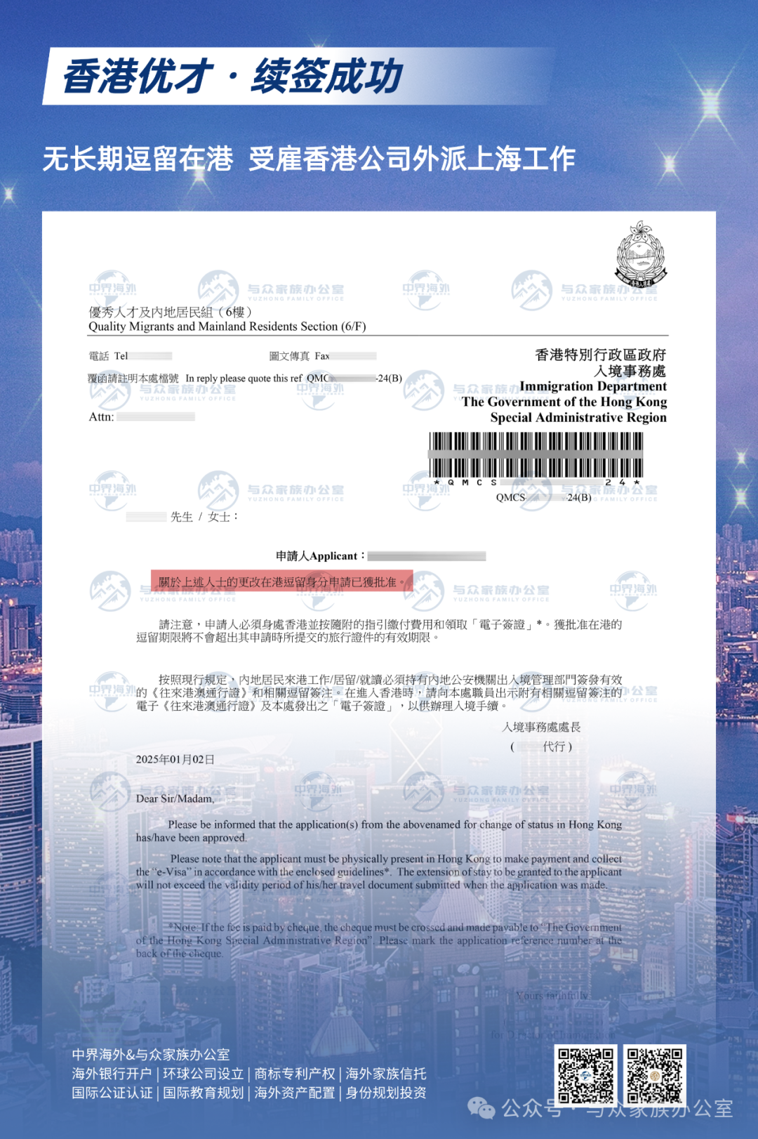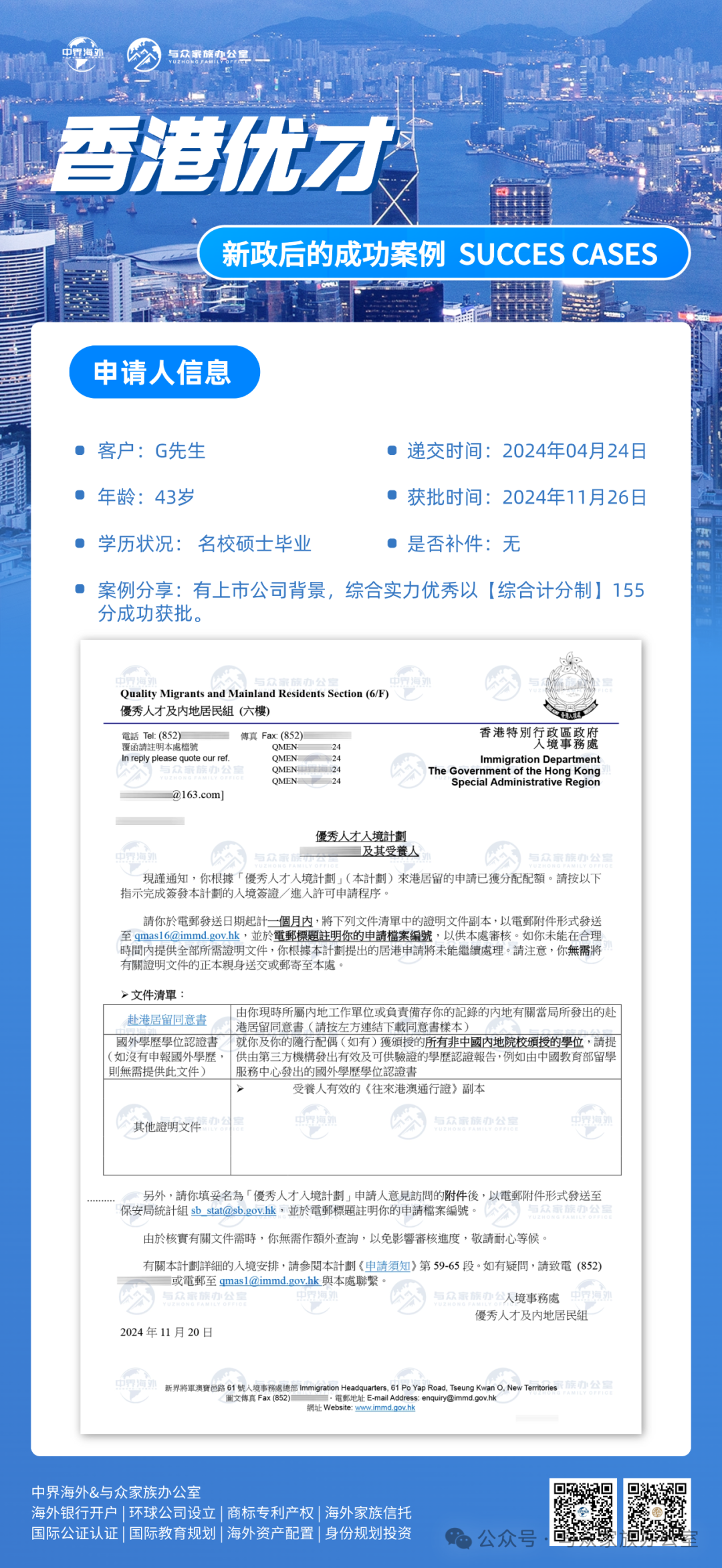 ![]() 以上学校的合资格大学硕博生、合资格大学指定学科硕博生,均可申请香港优才! ![]() 图 | 我司香港优才近期获批实例 2024年11月,香港优才计划更改递交规则,具体如下: ![]() 01 综合计分制调整: 取消了以前的逐项计分模式,改为通过 12 项是否准则来评估申请人,申请人需满足其中 6 项及以上才能入围递交申请,家庭情况、人才清单、名校学士等不再作为评选要求,新增了人才收入、业务所有权、行业设置等准则。 ![]() 02 审核时间缩短: 劳工及福利局局长表示,以往每宗个案处理约需时 9 个月,简化为新形式后,可由计算机系统先进行筛选,预计令申请期缩至6个月。 ![]() 03 审批流程变化: 香港新成立了一个评核委员会,来甄选提交的个案,为入境处处长的 “择优而取” 提供意见。评核委员会由劳工及福利局局长担任主席,委员包括其他相关政策局局长。 ![]() 04 新增顶尖人才机制: 预计 2025 年下半年起政府会开始主动邀请全球顶尖人才来港,受邀人士会交由政务司司长领导的「教育、科技和人才委员会」作最终拍板。 ![]() 05 人才清单更新扩容: 为发展和巩固八大中心地位,港府计划在 2025 年年初发布更新后的人才清单,加入推动八大中心所需的人才,且人才清单在网申系统不再作为单独计分项,而是合并至赴港计划书中的其中一项。 ![]() 申请人成功获批可直接拿3年的签证,后续通过3+2年的模式续签,直至符合7年永居资格申请永居。