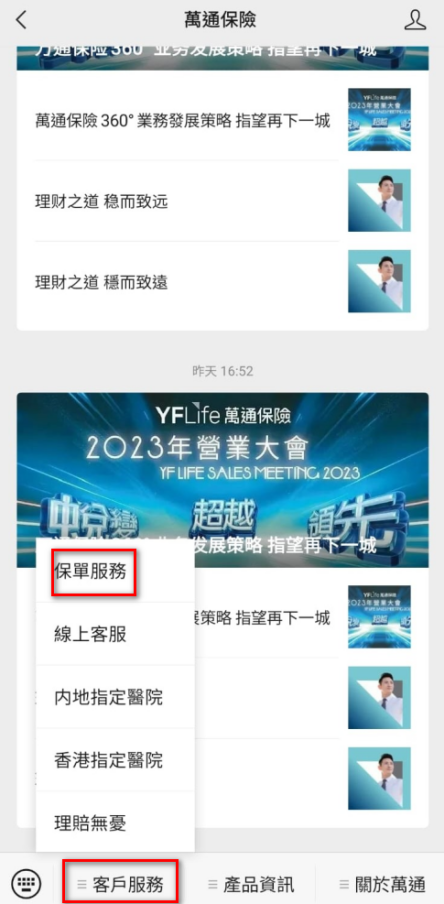干货帖|万通APP「YFlife」使用攻略,手把手教你!一定用得上!![]() 2024 年第三季度,万通保险业绩一路狂飙!整体公司新造业务年度化保费同比飙升 89%,强劲增长势头势不可挡! 关注万通的朋友们应该都知道,万通保险的最新动态就是旗舰储蓄产品「富饶千秋Plus」,想了解的朋友可参阅《**的卷王它又来了!万通「富R千秋」2025年全新升级!》。 ![]() 别急,小编今天就给大家安排上万通保险「APP」超详细操作指南,一键解锁便捷保单管理! ![]() ![]() ![]() IOS系统: 在Apple Store或Google Play搜索"YFLink",或扫描上方二维码下载APP。 ![]() Android 系统: 如若安卓手机无法下载Google Play,可直接复制下方的链接到手机浏览器上下载: https://eapp.yflife.com/yflink/index_apk.htm ![]() 微信公众号直接登录: 您也可以从微信公众号快速进入,使用[保单服务]功能: ![]() 进入【保单服务】后,进行登录以及其他操作: 下载后,需要登入/注册,首次使用的朋友在注册页面,输入自己的手机号码(投保万通保单时登记的手机号码,必须与客户在保险公司登记的记录相同),填写手机验证码登陆后即可注册成功。 然后输入保单持有人的名字、出生日期及身份证号码就能登录啦!登录后搜索和绑定所有适用保单就行啦。 ![]() ![]() ![]() ![]() YFLink可查阅保单详情、更改保单资料(通讯地址、联络电话、电子邮箱、自动转账日期)、更改投资选择(适用于投资相连保单)、缴交保费、查看理赔记录。 ![]() 01 绑定保单 登录「应用程序」—点击「注册」—点击「请选择电话」—输入「验证码」点击「同意」—完成注册 登录后—点击绑定「个人保单」—输入「姓名」「出生日期」「身份证」—点击「连接」—输入「验证码」—点击「完成」—设置「个人密码」—点击右下角「我的」—选择「我的保单」—便可审阅您的保单 具体操作清查看如下视频操作步骤指南: *温馨提示:记得注册的手机号码,要和投保时的一样! ![]() 02 保单缴费 登录「应用程序」—点击「我的」—点击「更多」—选择「更改缴费方式」选择「需要更改的保单」—选择「缴费方式」—点击「提交并付款」—选择「付款方式」—根据指示完成付款—点击「完成」 具体操作清查看如下视频操作步骤指南: *温馨提示:如果是香港客户可以选择转数快! ![]() 03 保单投资选择 登录「应用程序」—点击「我的」—点击「投资选择调动」—选择「更改投资选择分配比率」阅读后选择「同意」—选择「调整比率和新增投资」—点击「类别」—选择「投资产品」—点击「下一步」检查后点击—「确认」 具体操作清查看如下视频操作步骤指南: *温馨提示:注意分配比率总和必须为100%。 ![]() 04 更改保单信息 登录「应用程序」—点击「我的」—点击「更多」—依变更需求点击「更改通讯地址」—「更改电话\电邮」—依页面提示填写相关信息进行变更。 具体操作清查看如下: *温馨提示: 提示1:如更改通讯地址,中国大陆地址必须填写邮政编号,澳门地址必须填写街道名称及号数。 提示2:如更改电话,必须提供手机号码,完成更改后用新的手机号码登录。 提示3:如果客户需要更改密码,则需在YFLink APP中点击【更改密码】,设定——管理密码——更改业务密码,输入现在的密码和验证信息(保单持有人名字、出生日期和身份证号码),然后输入新密码就可以了。 注:文章部分来源网络,转载仅作分享,侵删 有了这款万通APP[YFLink],一站式服务及信息应用程序,提供多元化功能,让你随时、随地、随心、去管理你的个人保单,如查看保单申请进度、查阅保单相关文件、浏览最新产品信息等。 您的万通保单,触手可及! ![]() 若您希望深入了解香港保险,可以扫描下方二维码,我们将有专业的顾问老师为您提供「私人定制+专属服务」。 ![]() ![]() 如果您想了解更多最新消息或疑难,欢迎长按识别并添加上方二维码详询哦,小编将为您一对一解答~ 好啦,以上就是今日分享啦!关注【与众家族办公室】,给您最专业的建议、最用心的服务~ ![]() 推荐阅读 ![]() ![]() ![]() ![]() ![]() ![]() 点个“在看”不失联